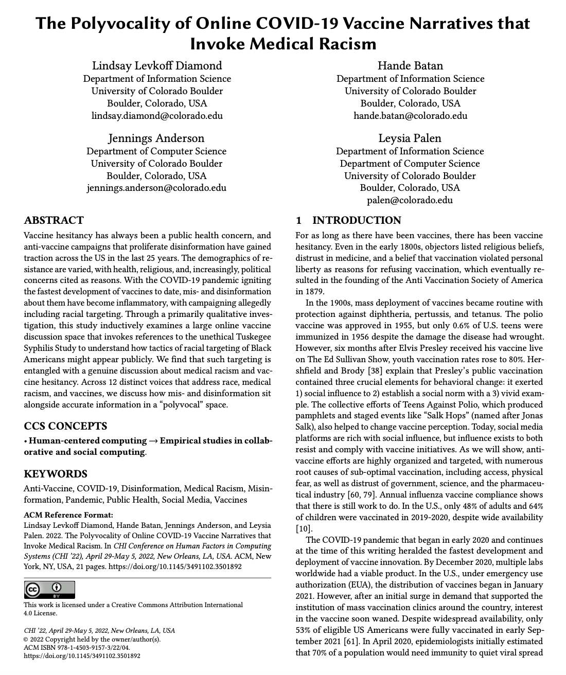 First page of the CHI 22 paper: The Polyvocality of Online COVID-19 Vaccine Narratives that Invoke Medical Racism